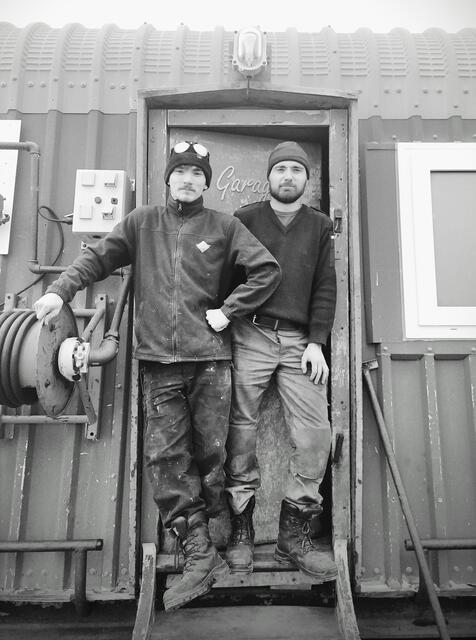 Postés devant la porte du garage de la station Dumont d'Urville - 13232 - Grare Estelle